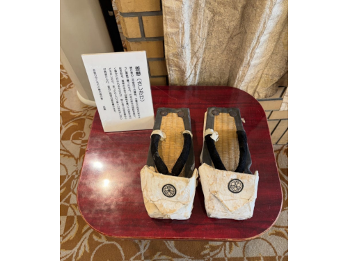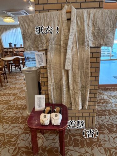 お松明の燃え殻、紙衣などがロビーに飾ってあり、
